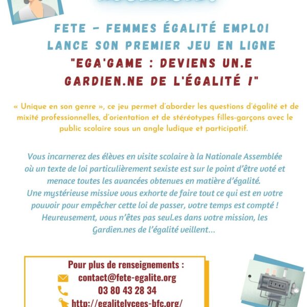 Ega'game : Deviens gardien·ne de l'égalité est un jeu créé à l'été 2020 pendant le confinement lié au Covid, dans le but de pouvoir continuer à sensibiliser les élèves sur la thématique alors qu'il n'était plus possible d'intervenir en classe. De nombreuses interventions ont été programmées dans des collèges et lycées de toute la région Bourgogne – Franche-Comté.